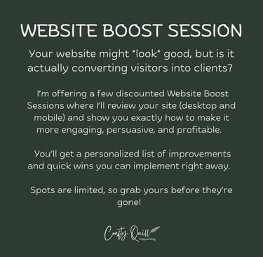 This Website Boost Session is a special opportunity to get an expert review of your website’s copy and design on both desktop and mobile. I will screen record as I review your website and transcribe the audio so you always have it to refer back to!